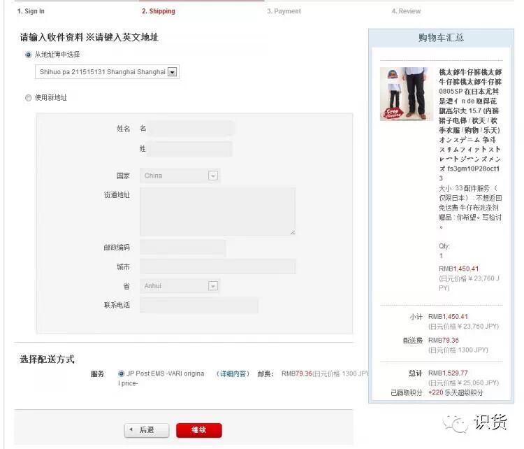 选地址,部分店铺可以直接用国内地址(拼音)直邮,也有的店铺只能转运,可以填转运,Tenso或者JS,也可以直接EMS,Tenso有时候会和乐天做活动,半价运费之类的,还是挺实惠的